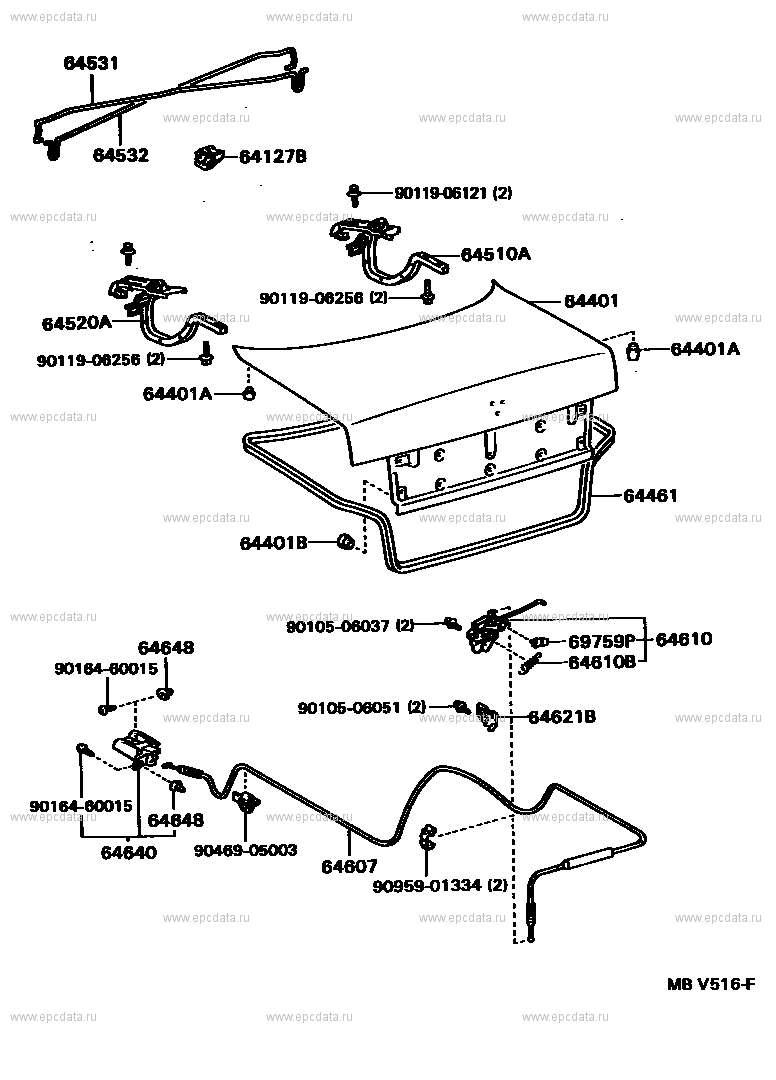 64531 BAR, LUGGAGE DOOR HINGE TORSION, RH 64532 BAR, LUGGAGE DOOR HINGE TORSION, LH 64127B SUPPORT, LUGGAGE COMPARTMENT DOOR TORSION BAR 9011906121 ** Std Part 64510A HINGE ASSY, LUGGAGE COMPARTMENT DOOR, RH 9011906256 ** Std Part 64401 PANEL SUB-ASSY, LUGGAGE COMPARTMENT DOOR 64520A HINGE ASSY, LUGGAGE COMPARTMENT DOOR, LH 64401A CUSHION(FOR LUGGAGE COMPARTMENT DOOR PANEL) 64461 WEATHERSTRIP, LUGGAGE COMPARTMENT DOOR 64401B PLUG, HOLE(FOR LUGGAGE COMPARTMENT DOOR PANEL) 9010506037 ** Std Part 64610 LOCK ASSY, LUGGAGE COMPARTMENT DOOR 69759P SNAP, DOOR LOCK CONTROL LINK 64648 GROMMET, LUGGAGE DOOR LOCK OPENER 64610B SPRING, TENSION(FOR LOCK) 9016460015 ** Std Part 9010506051 ** Std Part 64621B STRIKER, LUGGAGE COMPARTMENT DOOR LOCK 9046905003 ** Std Part 64640 OPENER ASSY, LUGGAGE DOOR LOCK 64607 CABLE SUB-ASSY, LUGGAGE DOOR LOCK CONTROL 9095901334 ** Std Part |