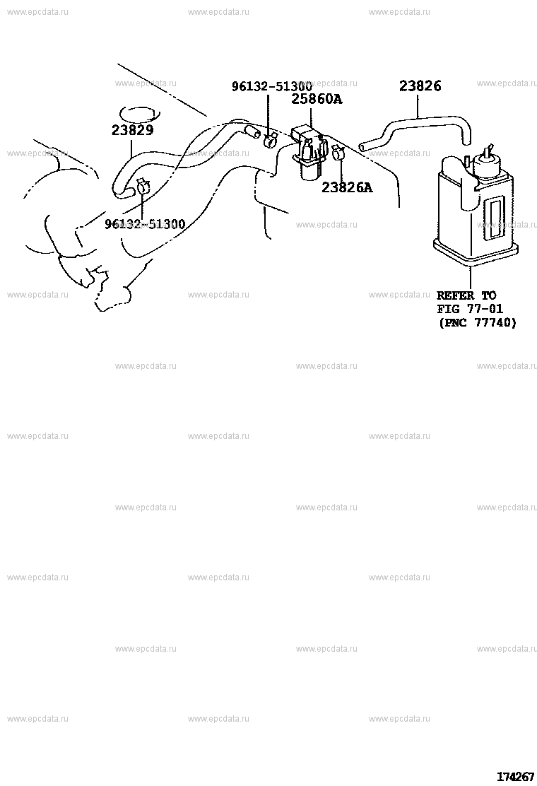 Click part number in the scheme or in the list: 23829 HOSE, FUEL VAPOR FEED, NO.39613251300 ** Std Part 25860A VALVE, VACUUM SWITCHING, NO.1 23826A CLIP(FOR FUEL VAPOR FEED HOSE, NO.1) 23826 HOSE, FUEL VAPOR FEED, NO.1 ** 77-01 |