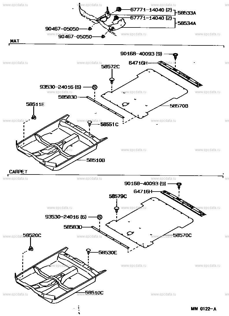 Click part number in the scheme or in the list: 6777114040 ** Std Part58533A COVER, FLOOR CARPET, CENTER RH 58534A MAT, TRANSMISSION COVER 9046705050 ** Std Part 9016840093 ** Std Part 64716H COVER, DECK TRIM, REAR 58572C CLIP, REAR FLOOR MAT SET 9353024016 ** Std Part 58583D PLATE, REAR SEAT BACK CARPET SUPPORT 58511E CLIP(FOR FRONT FLOOR MAT) 58570B MAT ASSY, REAR FLOOR 58551C CLIP(FOR FLOOR MAT, REAR) 58510B MAT, FRONT FLOOR, FRONT 58579C CLIP, REAR FLOOR CARPET SET 58520C CLIP(FOR FRONT FLOOR CARPET) 58570C CARPET ASSY, REAR FLOOR 58530E CLIP(FOR FRONT FLOOR REAR CARPET) 58510C CARPET ASSY, FRONT FLOOR, FRONT |