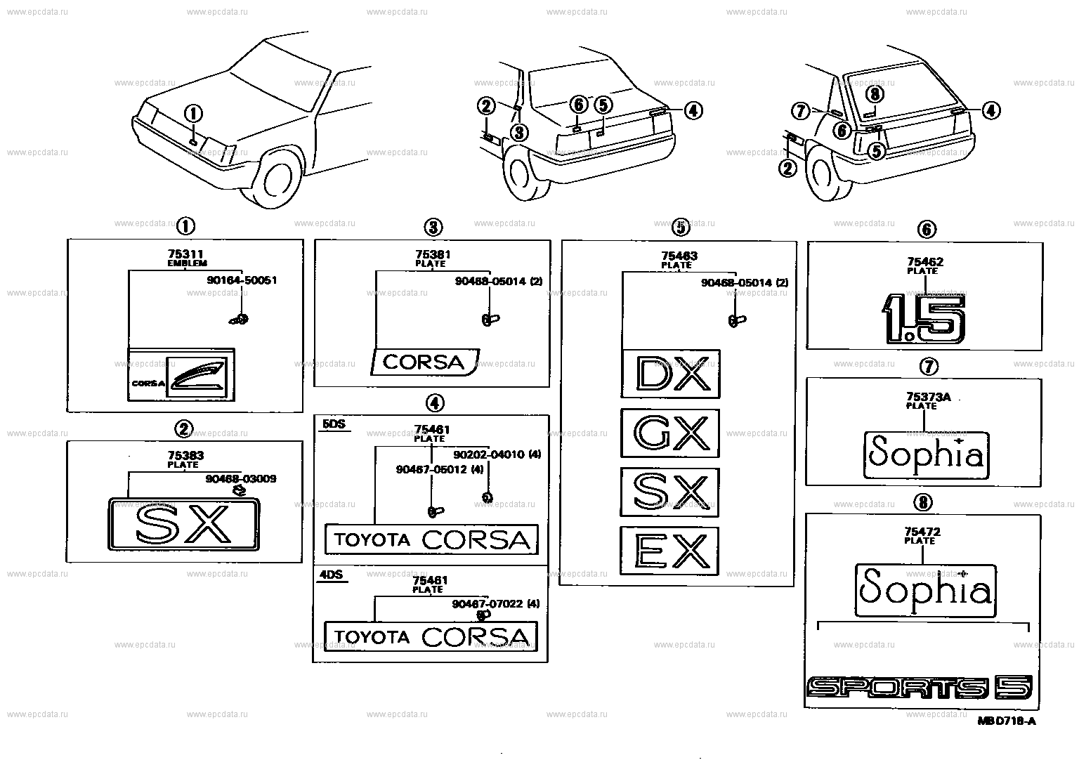 Click part number in the scheme or in the list: 75311 EMBLEM, RADIATOR GRILLE (OR FRONT PANEL)75381 PLATE, QUARTER PANEL OR SIDE PANEL NAME (MODEL MARK) 75463 PLATE, REAR NAME, NO.4 (GRADE MARK) 75462 PLATE, REAR NAME, NO.3 (DISPLACEMENT) 9016450051 ** Std Part 9046805014 ** Std Part 75373A PLATE, QUARTER WINDOW MARK 75461 PLATE, REAR NAME, NO.2 (MODEL MARK) 9020204010 ** Std Part 75383 PLATE, QUARTER PANEL OR SIDE PANEL NAME (GRADE MARK) 9046705012 ** Std Part 9046803009 ** Std Part 75472 PLATE, REAR WINDOW NAME 9046707022 ** Std Part |
