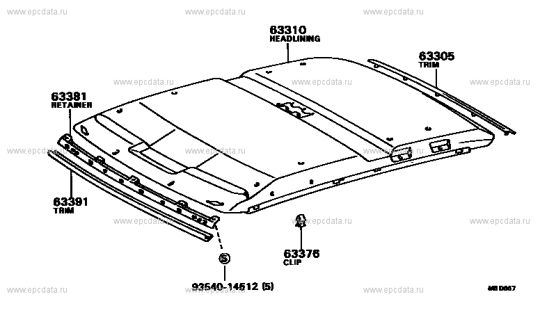 Click part number in the scheme or in the list: 63310 HEADLINING ASSY, ROOF63305 BOARD SUB-ASSY, ROOF REAR TRIM 63381 RETAINER, HEADLINING, FRONT 63391 TRIM, ROOF HEADLINING, FRONT 63376 CLIP, HEADLINING 9354014512 ** Std Part |